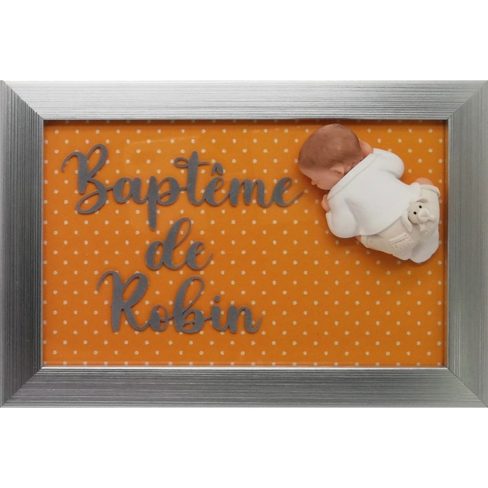 Ce cadre personnalisé “Baptême de …” est le cadeau idéal pour célébrer ce moment spécial. Avec une miniaturisation de bébé ajoutant une touche de charme, ce cadre peut être placé sur la table des cadeaux pour que tout le monde puisse l’admirer.